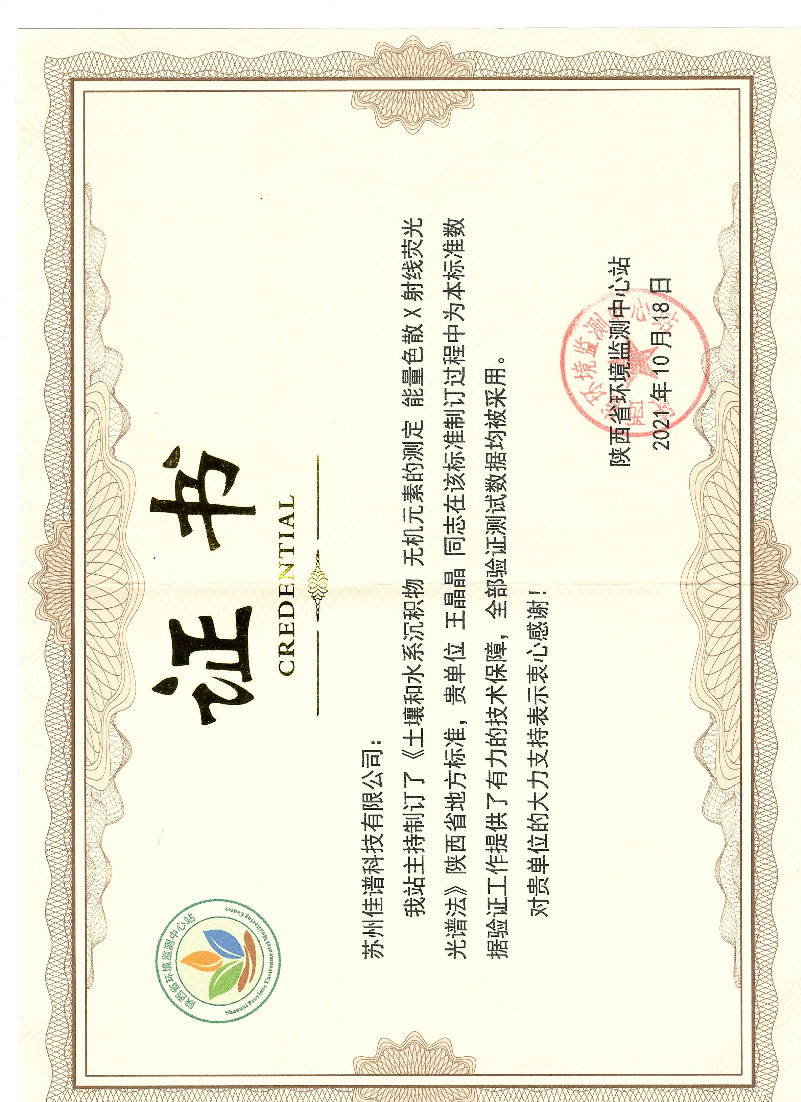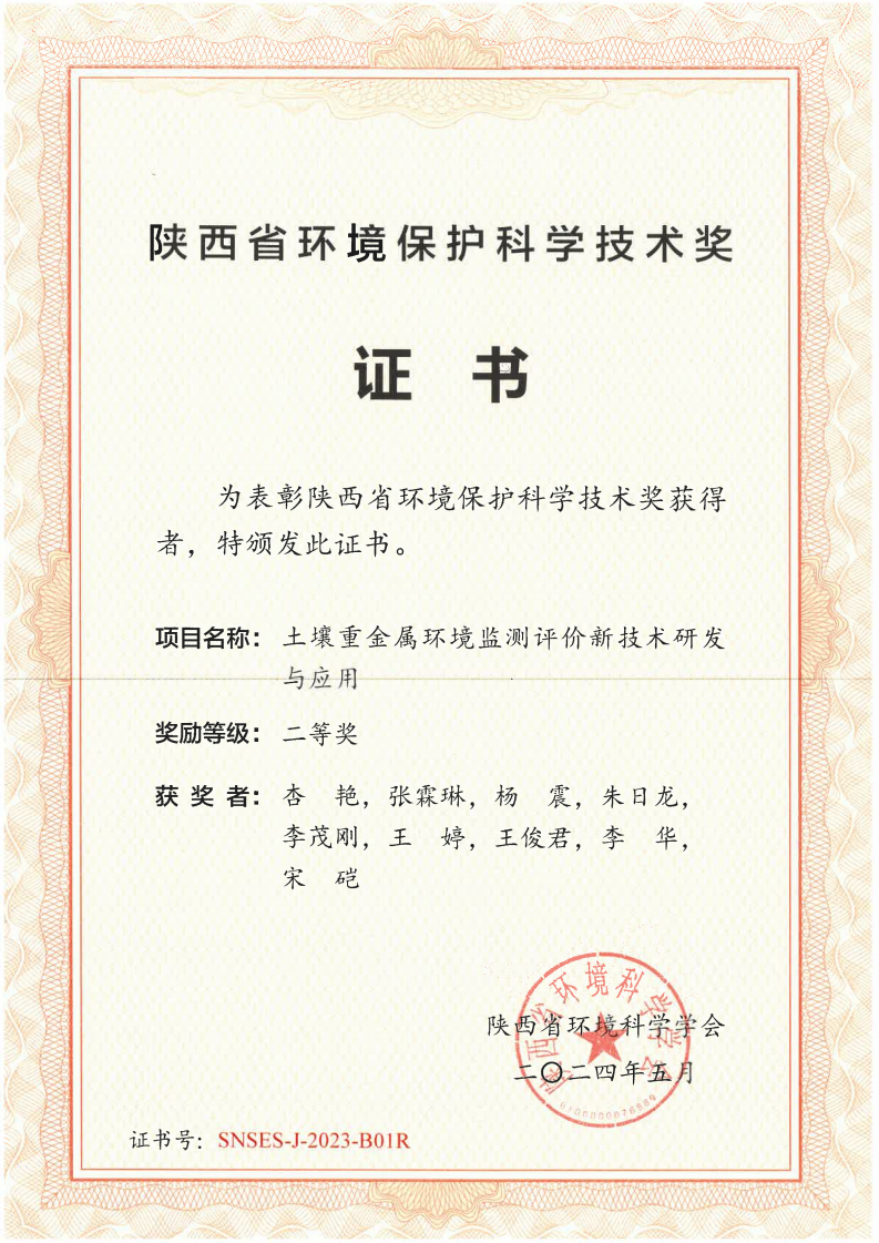 2021年獲得陜西省環(huán)境檢測中心站頒發(fā)證書_王晶晶