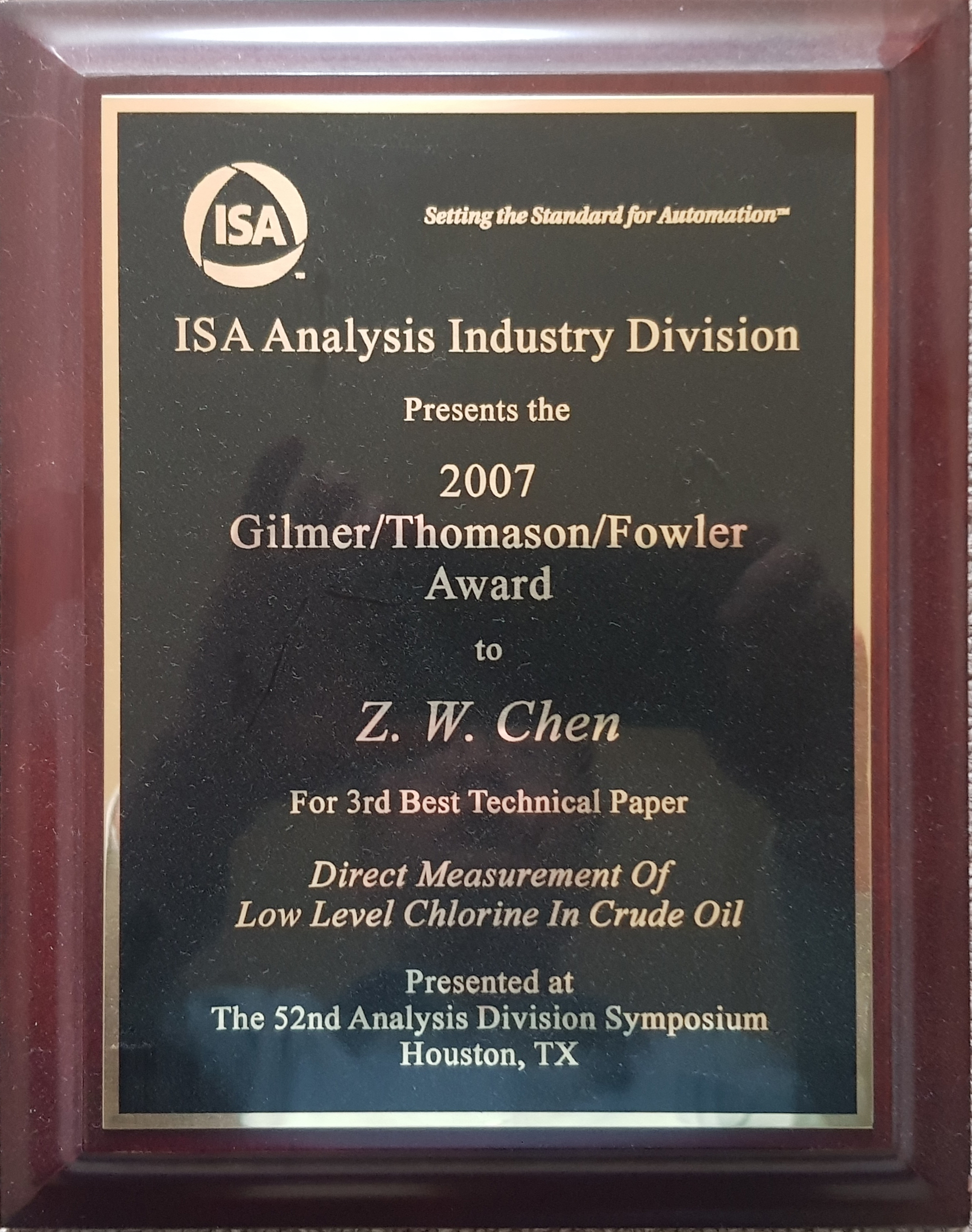 2007年9月美國儀表儀器自動化系統(tǒng)協(xié)會(ISA)Gilmer/Thomason/Fowler獎_陳澤武