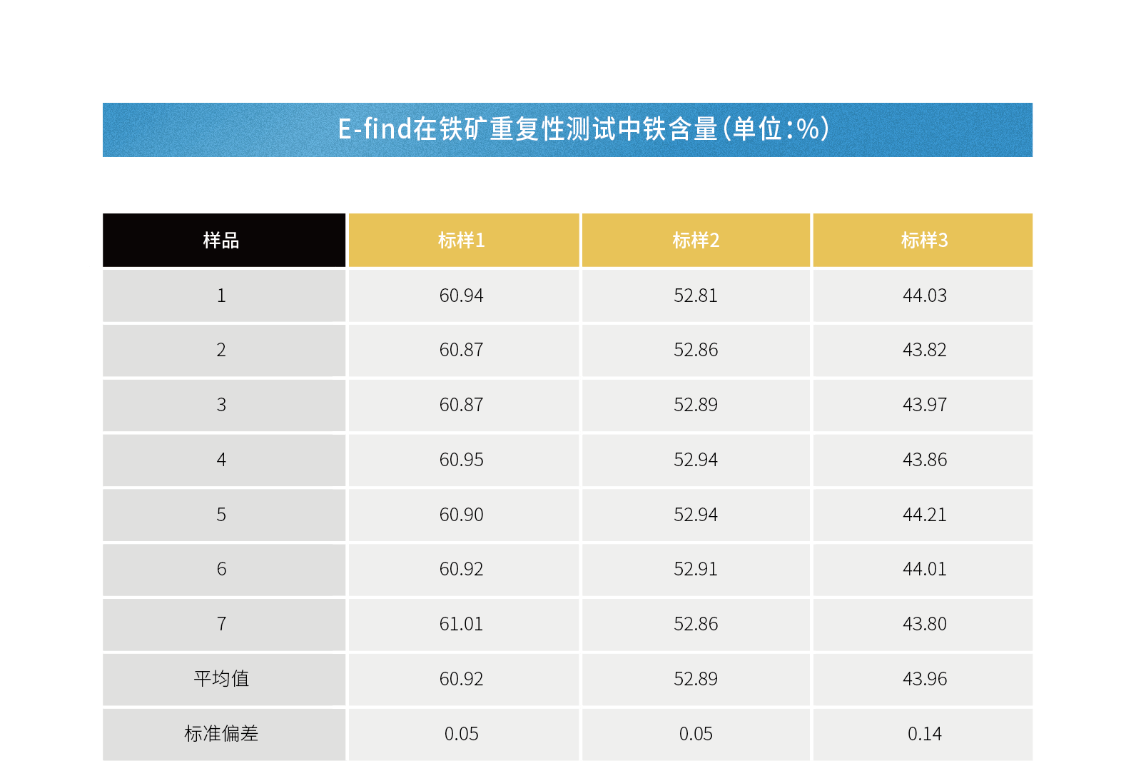 E-find系列儀器可以針對各種類型的礦物通過基本參數(shù)法對基體進行校正,且只需簡單制樣就可以得到高精度的 測試結(jié)果,與實驗室測試結(jié)果高度一致;可以針對各種類型的礦物及礦物中多種元素進行高精度分析,可高效快速 進行原料或礦樣品質(zhì)評價。