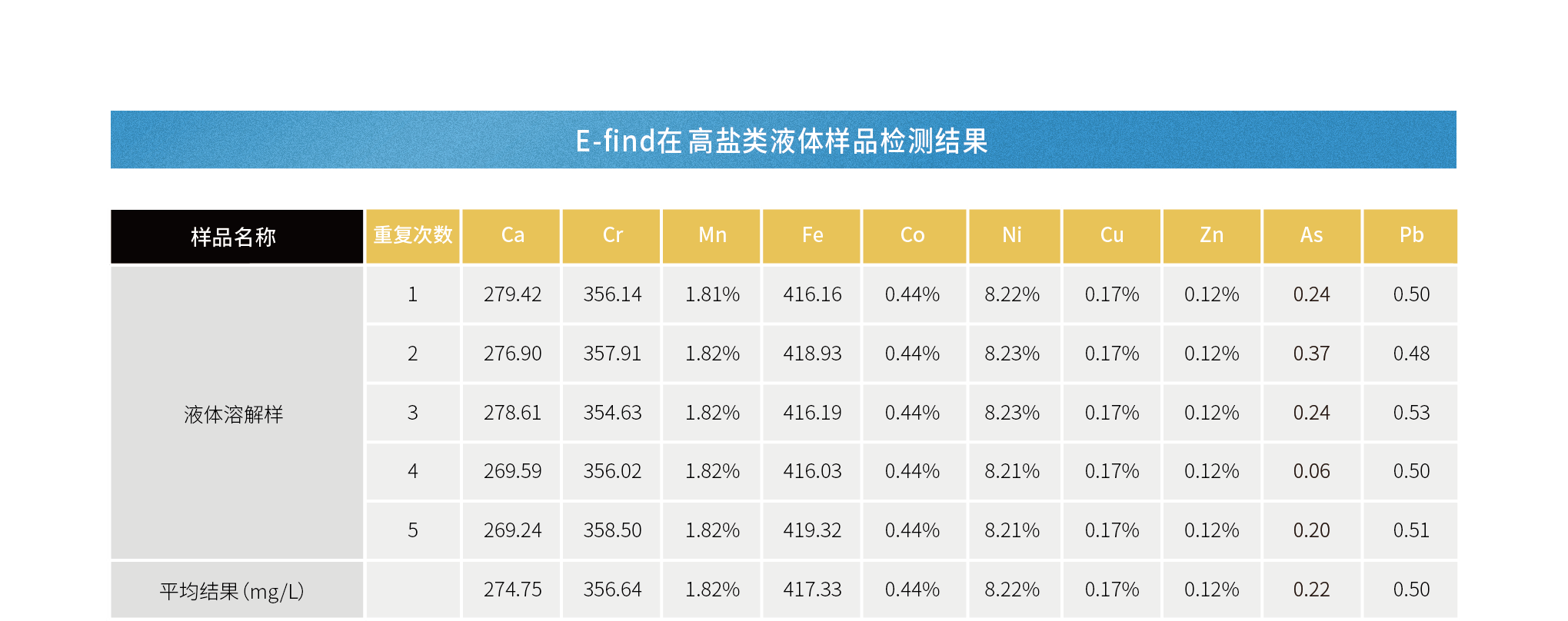 E-find系列儀器可以對新能源中的材料進行高精度分析。如三元鋰電池中,可以應(yīng)用于生產(chǎn)中控環(huán)節(jié)中原材料高冰鎳萃取液、循環(huán)水廢渣、廢液前驅(qū)體等樣品中的微量元素、主量元素進行準確定量分析;下列是E-find在高鹽類液體樣品重復(fù)檢測結(jié)果,每個樣品2次重復(fù)檢測,每次檢測時間為5分鐘。