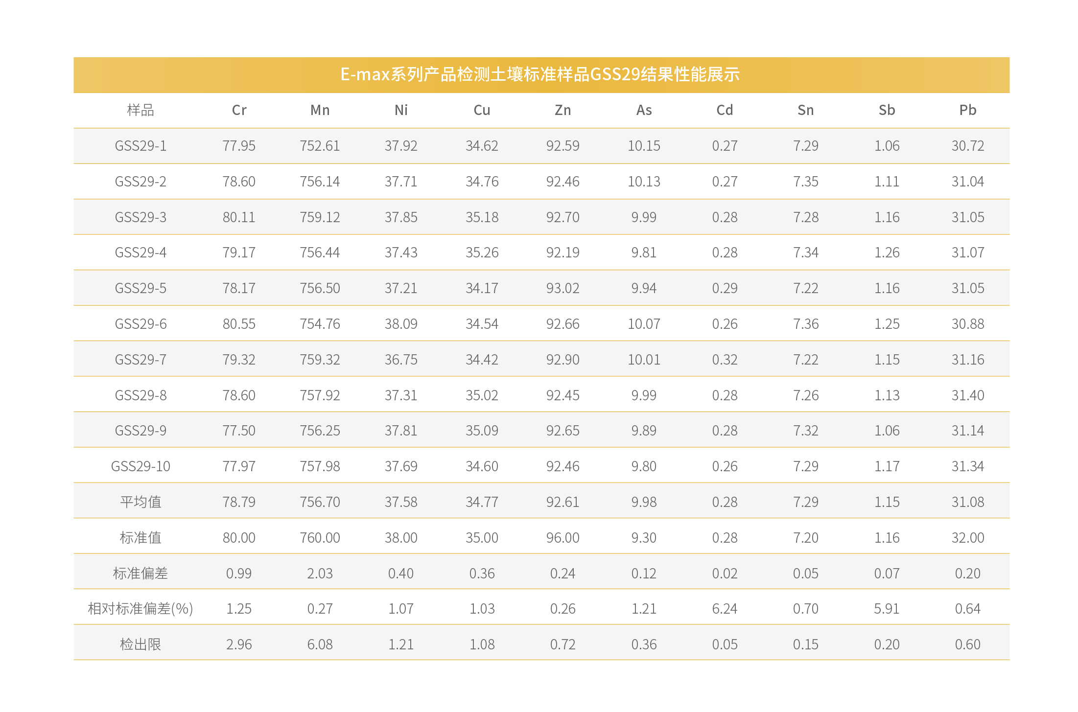 滿(mǎn)足GB15618-2018中對(duì)土壤中重金屬的篩查及管控要求,其中對(duì)鎘的合規(guī)要求是0.3mg/kg,而E-max系列檢測(cè)極限可以達(dá)到0.05mg/kg。