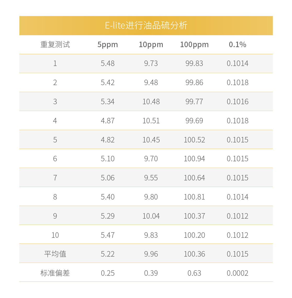 E-lite 符合 ASTM D4294 , ISO 8754 , ASTM D7220等 標(biāo)準(zhǔn)方法,可對原油、柴油、汽油、船用燃油和潤滑油等 碳?xì)浠衔镞M(jìn)行硫分析。 E-lite的檢出限低至0.5ppm,可提供精確的硫分析。下圖中的數(shù)據(jù)表示E-lite 在分析的10 個單獨(dú)的原油試樣。