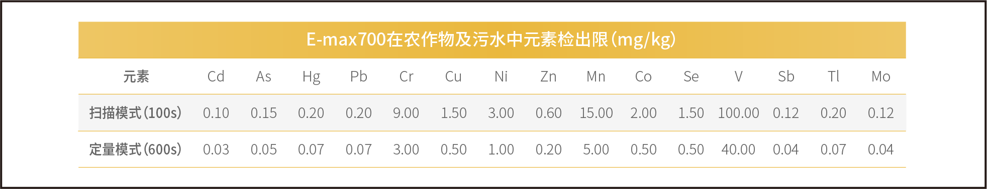 E-max700在農(nóng)作物及污水中元素檢出限(mg/kg)